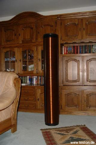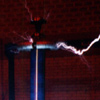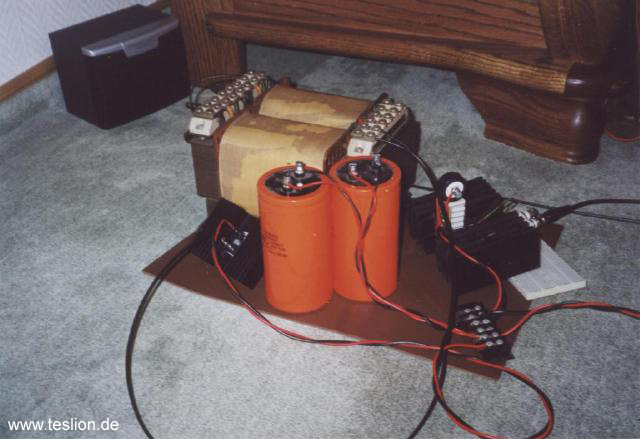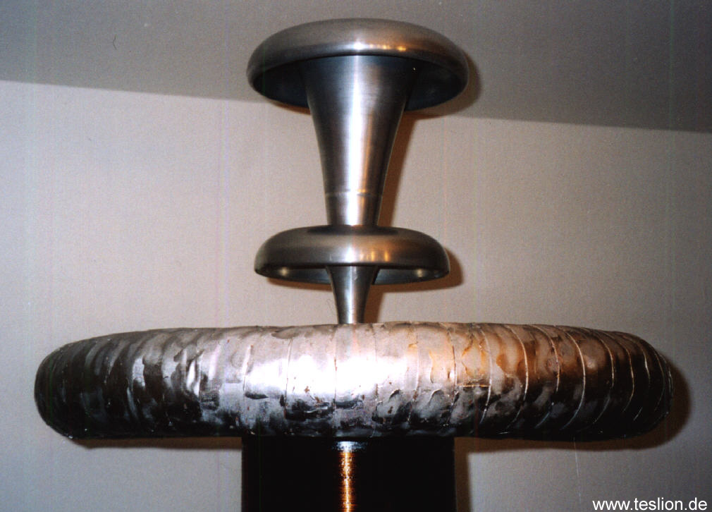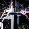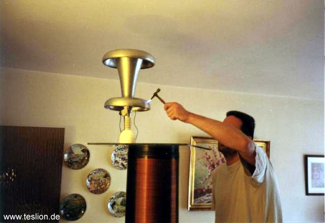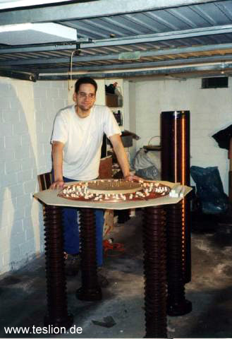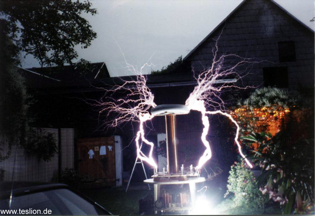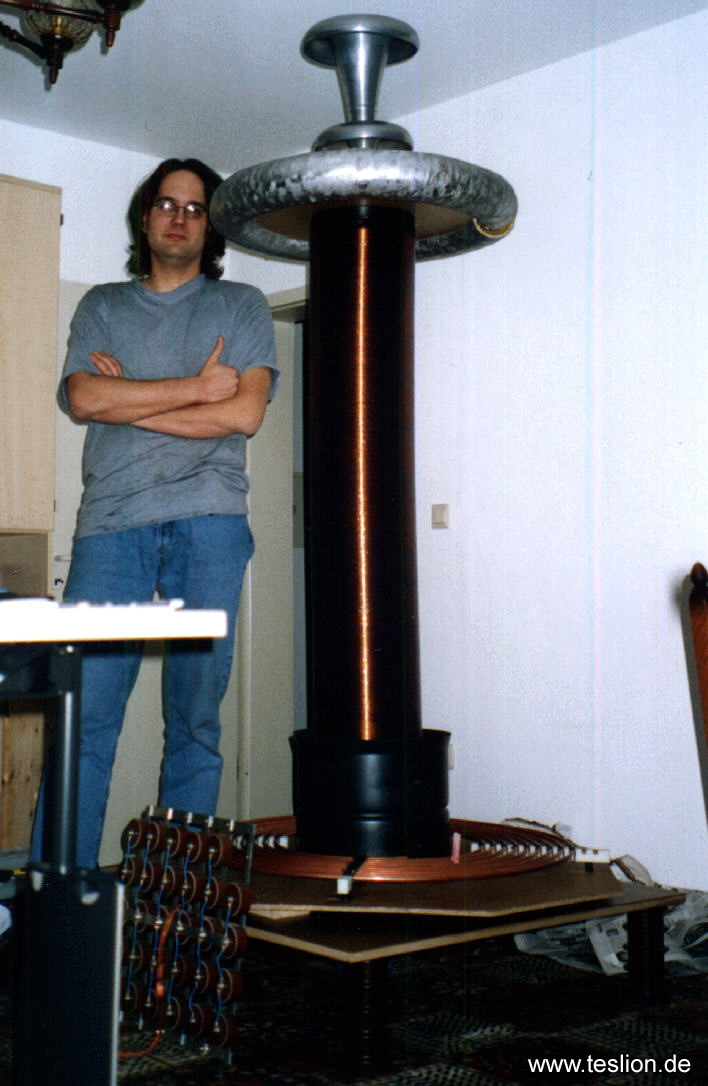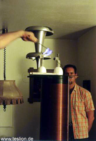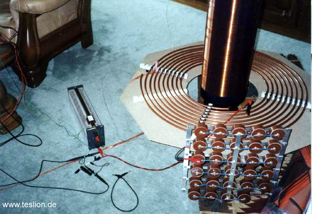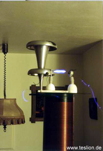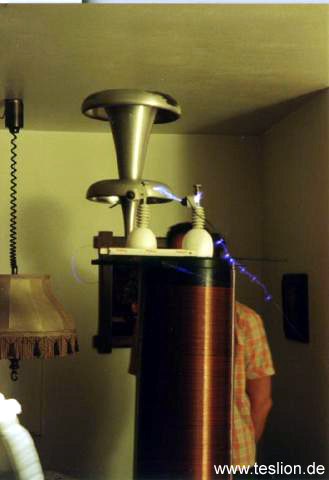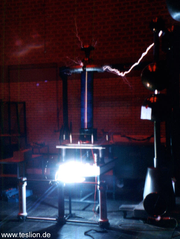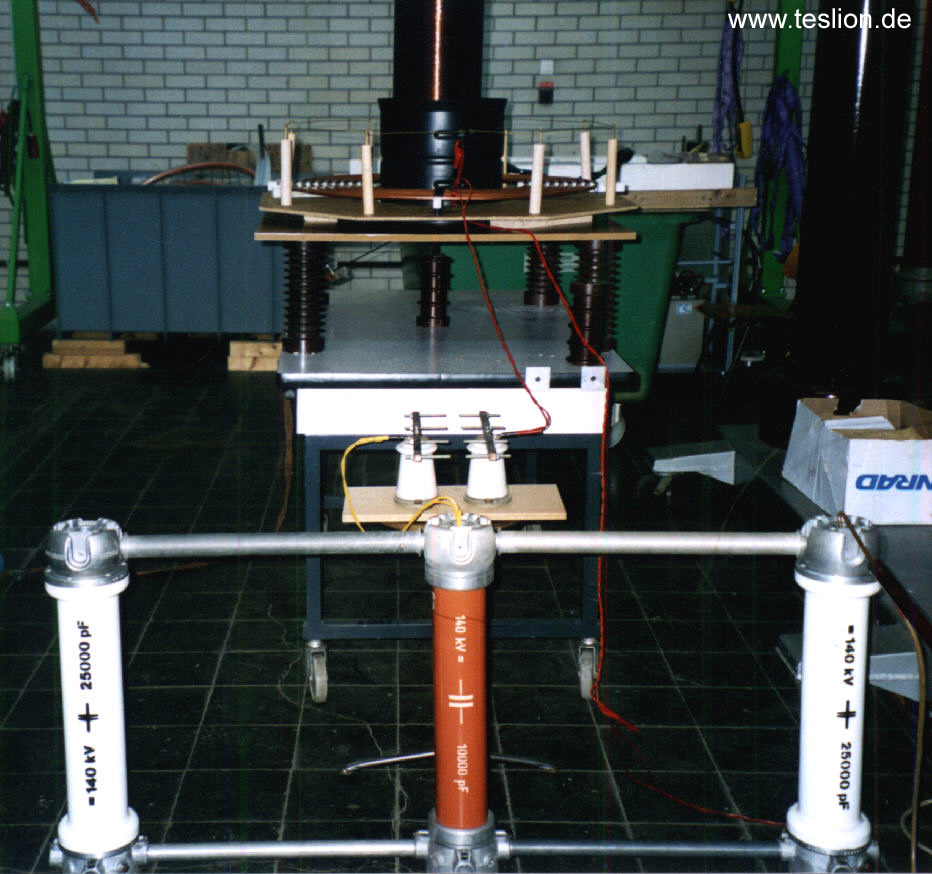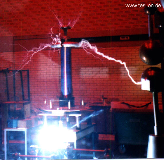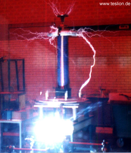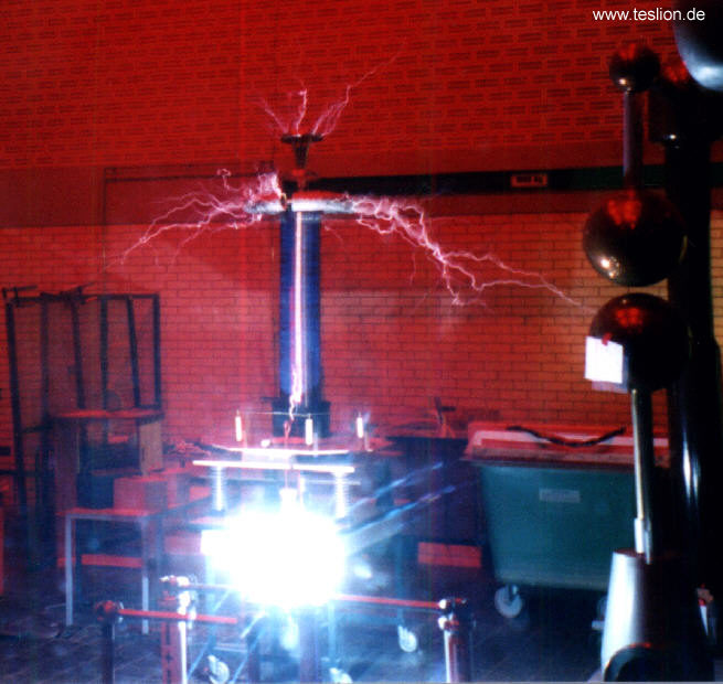 Teslatrafo im Probebetrieb zur Abstimmung, mit im Bild der Primärkondensator |