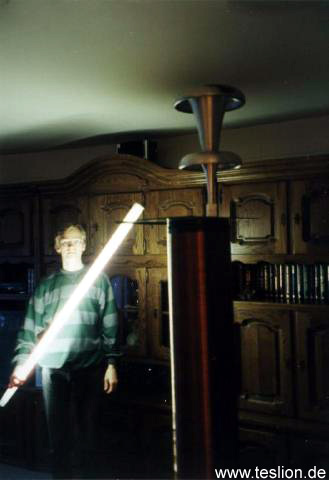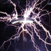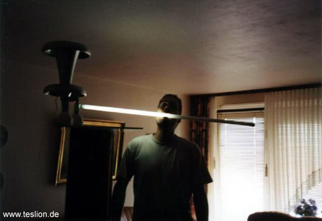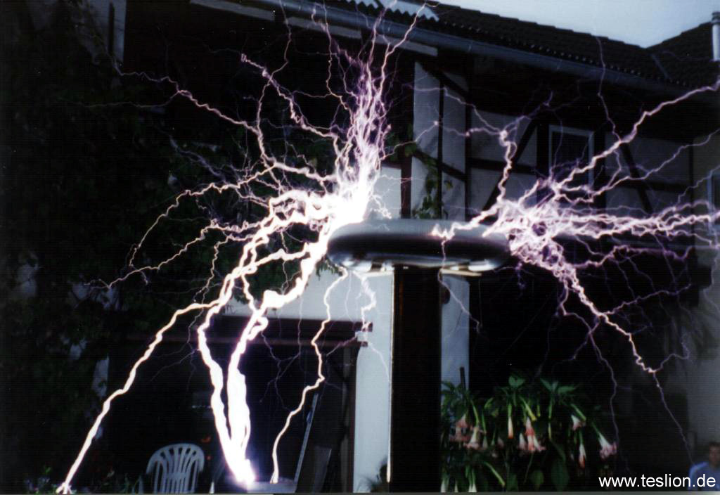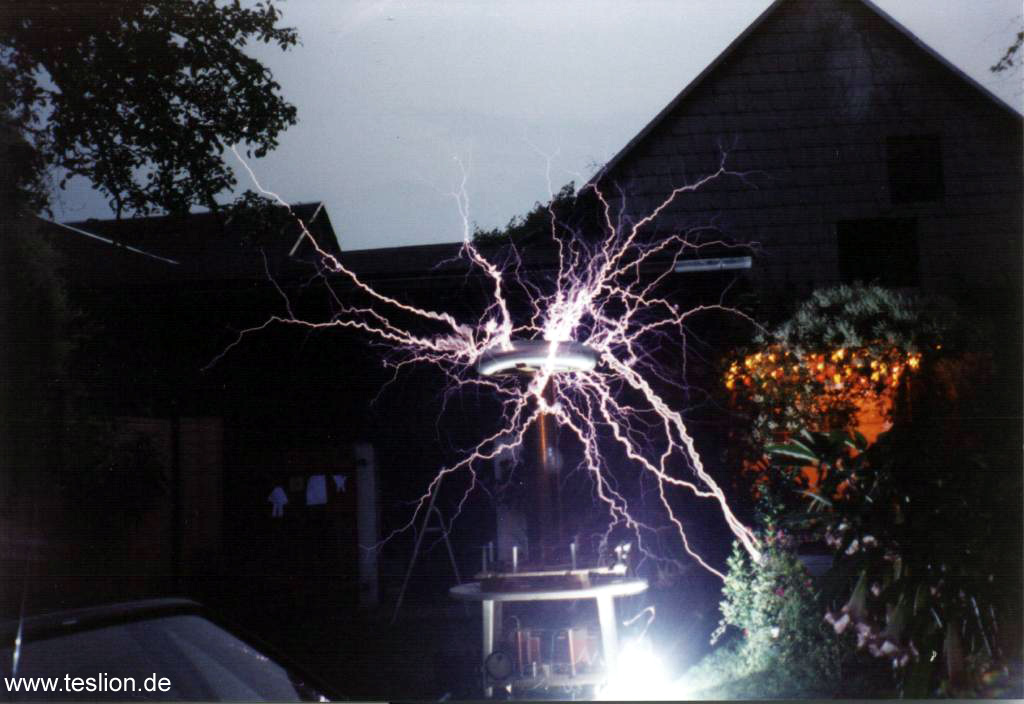 Blitze schlagen in die nahestehende Kugelfunkenstrecke ein. Abstand rund 2m. |