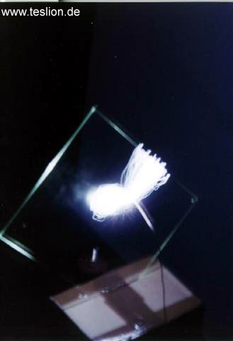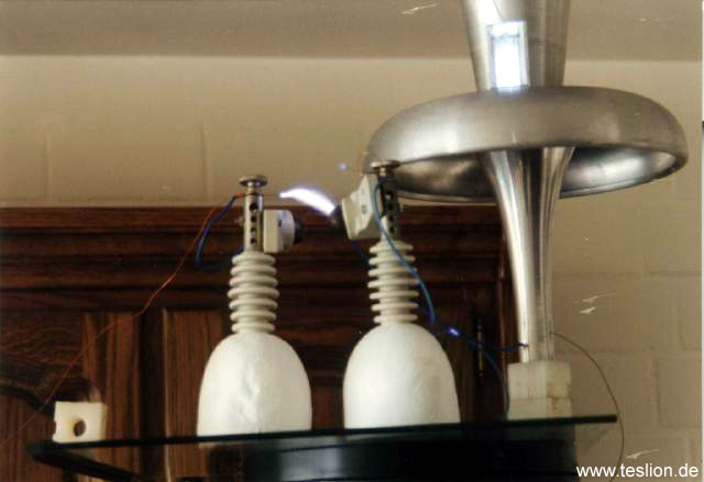 Testbetrieb mit 20V bei Nadelspitze und Kugel, oben Xenon-Blitzröhre |